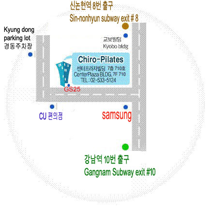 From Sin-nonhyun station Exit # 8, go straight to the way of Gangnam subway , you see the Woori Bank, take a right at the Woori Bank , you can see Beige brick Bldg Located just Opposite side of Tarr Tarr and CU , Center Plaza Bldg suite 710 (1st GS 25 Mart)